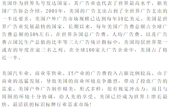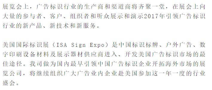 自1947年以来,美国国际标识协会每年三、四月在美国奥兰多和拉斯维加斯市轮流举办美国国际标识展览会(ISA International Sign Expo),到2017年已连续举办72届了,该展览会是世界上历史最久的广告标识专业的展览会,目前已经发展为全球最具行业权威性的标识标牌与广告行业展览会之一。
